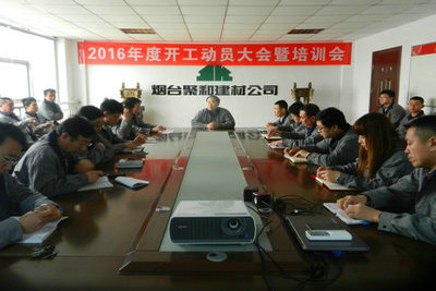 2016年3月7日下午,聚和建材和東泰物流公司在駐地二樓會議室召開2016年開工動員大會暨培訓(xùn)會,會議由總工程師、工會主席張敬忠主持,領(lǐng)導(dǎo)班子成員、各處室人員、各班組組長及員工代表共計40人參加了會議。